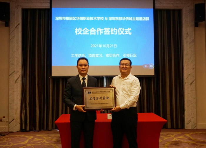 与华侨城酒店群签订校企合作协议目前,华强职校已和深圳市金融科技协会、深圳音乐厅、深圳图书馆、华为、腾讯、大疆、中兴通讯等企事业单位开展校企合作,共建一批校外实习实训基地,实行“学校+企业”双元培养的模式。2019年起连续三年被评为“产教融合典范职业学校”。学校与企业共同编制人才培养方案,大力推进“1+X”证书制度试点工作(“1”为学历证书,“X”为若干职业技能等级证书),将“1+X”职业技能等级认证标准和考核内容引入课程体系,学校获财税初级证书“全国考核优秀单位”。