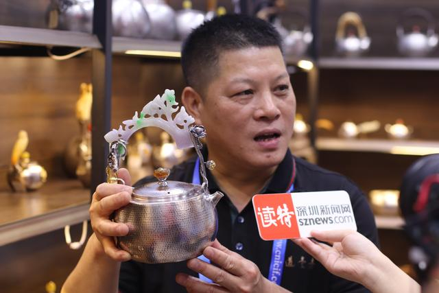 深圳新闻网2023年6月7日讯(记者 童小晋 张玲 张宇杰 实习生 张达成)光可鉴人的银壶,配上和田玉、玛瑙等玉石制成的手柄,不仅造型优美,也体现着广东人对养生和健康的追求。今天,广州道道一壶银器有限公司负责人李可生带着银壶来到了文博会。银壶泡茶有什么妙用?跟着深圳新闻网记者一起一探究竟吧。