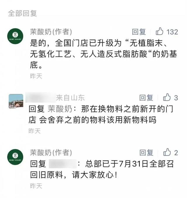 在宣布升级奶基底后,有消费者担心茉酸奶门店可能依然使用冰淇淋原浆作为奶基底,对此,8月4日,茉酸奶回应消费者质疑时称,茉酸奶在7月31日已经全部召回了旧原料。
