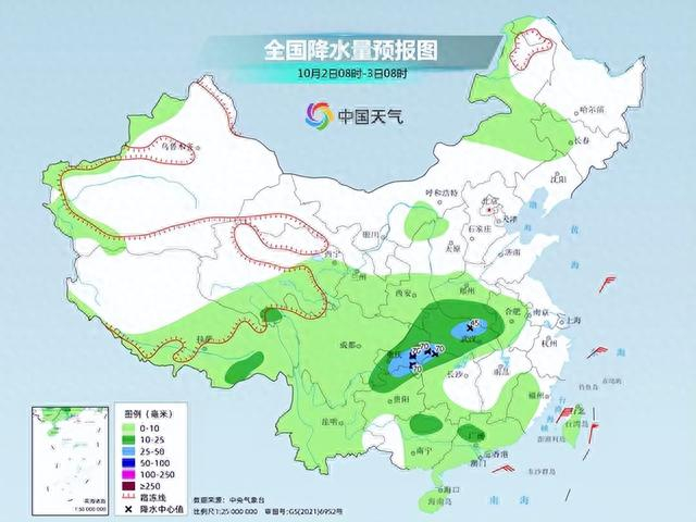 10月2日,华西地区有降水天气,重庆、贵州北部、河南南部、湖北大部、湖南北部等地的部分地区有中到大雨,局地有暴雨。