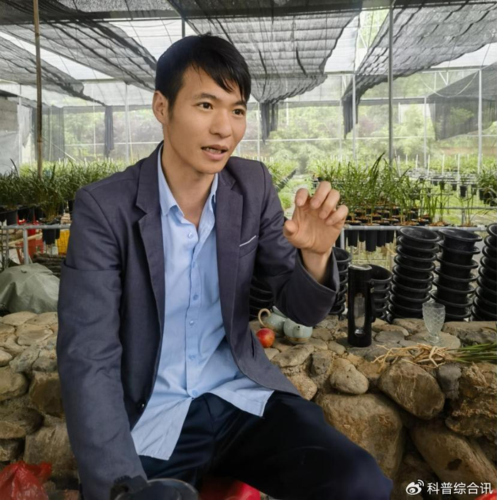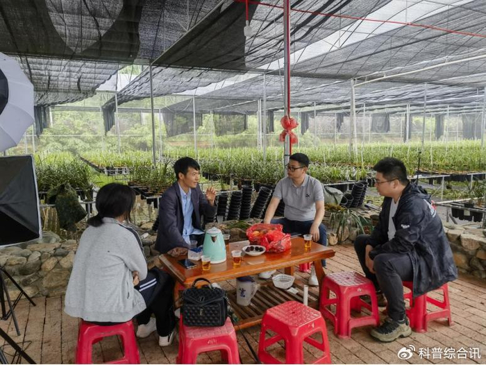 兰花基地里静待花开的兰花株苗一片片生机蓬勃,主播三姐熟练地对着镜头推荐不同品种的兰花。
