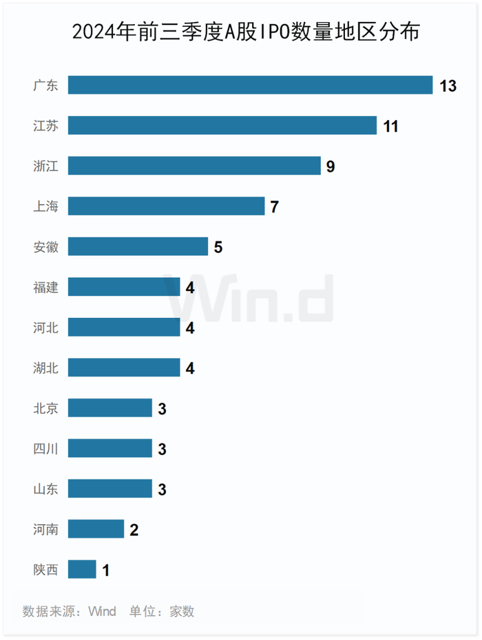 2024年前三季度A股IPO发行的69家公司中,来自广东的公司共有13家,数量居首;来自江苏的公司共有11家;浙江、上海、安徽分别有9家、7家、5家公司发行。