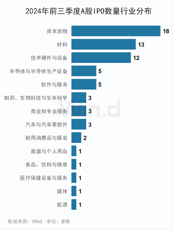 2024年前三季度A股IPO发行的69家公司中,来自资本货物行业的公司有18家,数量居首;来自材料、技术硬件与设备行业的公司分别有13家、12家;半导体与半导体生产设备、软件与服务行业均有5家公司发行。