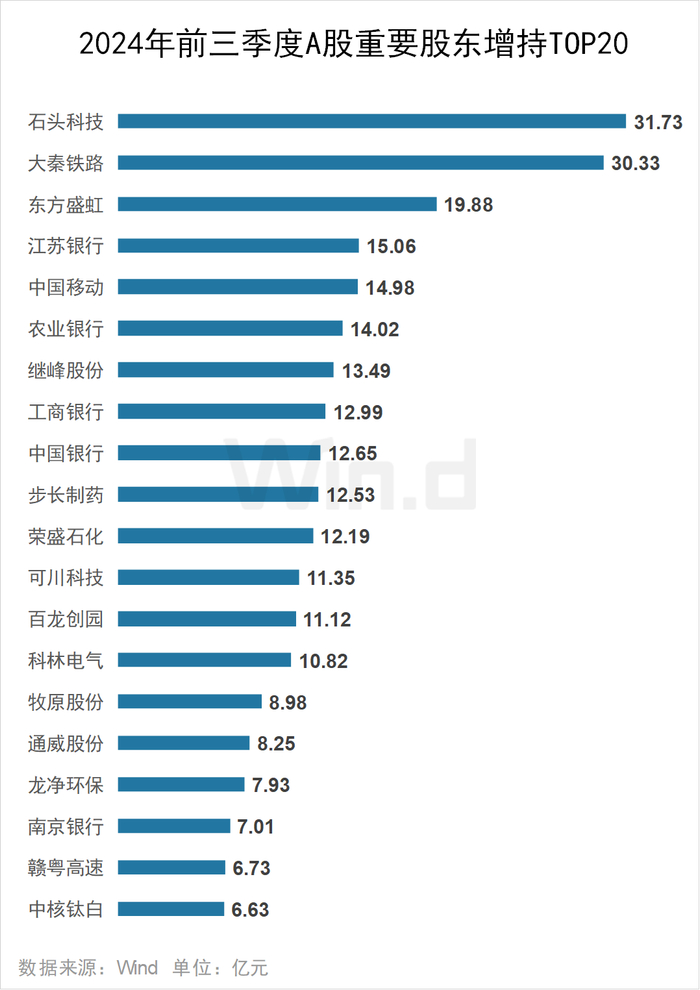 2024年前三季度,石头科技获重要股东增持31.73亿元,位居增持榜榜首;大秦铁路紧随其后,获重要股东增持30.33亿元。此外,东方盛虹、江苏银行、中国移动、农业银行、继峰股份、工商银行、中国银行、步长制药、荣盛石化、可川科技、百龙创园、科林电气均获重要股东增持超10亿元。