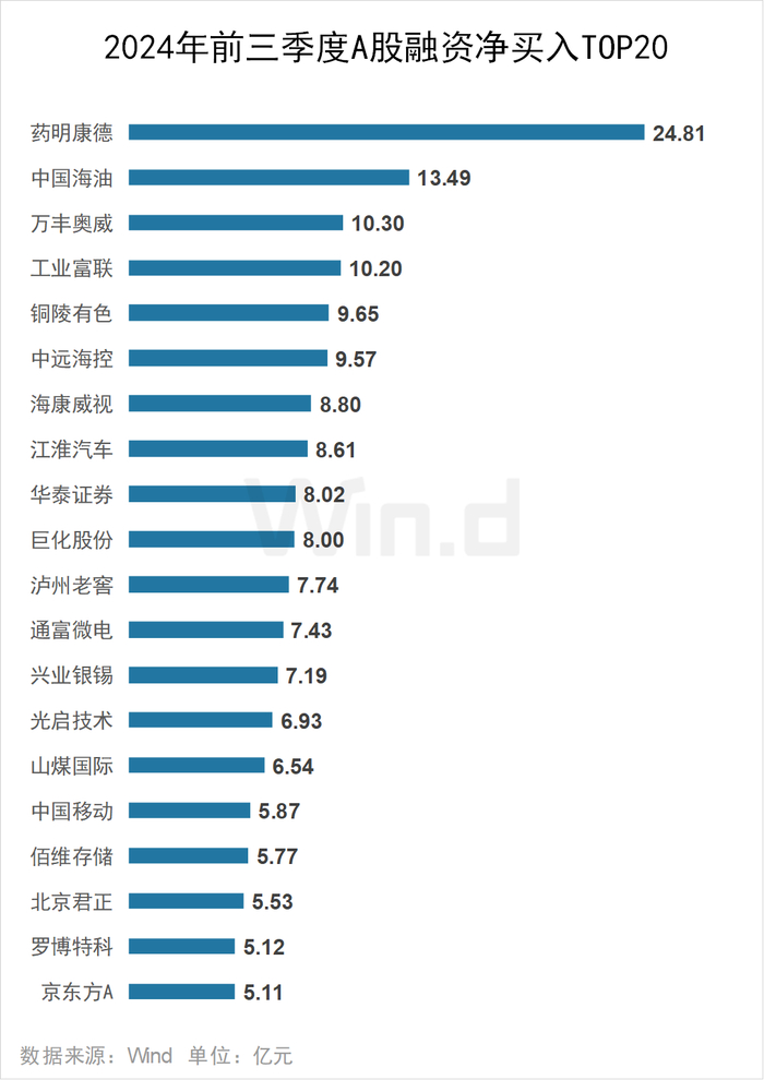 2024年前三季度,药明康德获杠杆资金大幅加仓,融资净买入额达9.68亿元居首。泸州老窖、罗博特科均获融资净买入超5亿元。