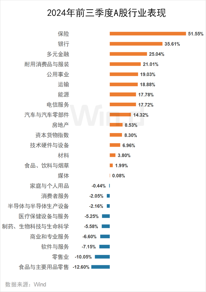 在Wind二级行业中,2024年前三季度共有15个行业上涨。大金融表现最为抢眼,保险行业涨幅居首,累计上涨51.55%,银行、多元金融累计涨幅分别为35.61%、25.04%。房地产行业9月末在政策强力提振下走高,累计上涨8.53%。食品与主要用品零售行业表现垫底,累计下跌12.6%,零售业、软件与服务行业跌幅居前。