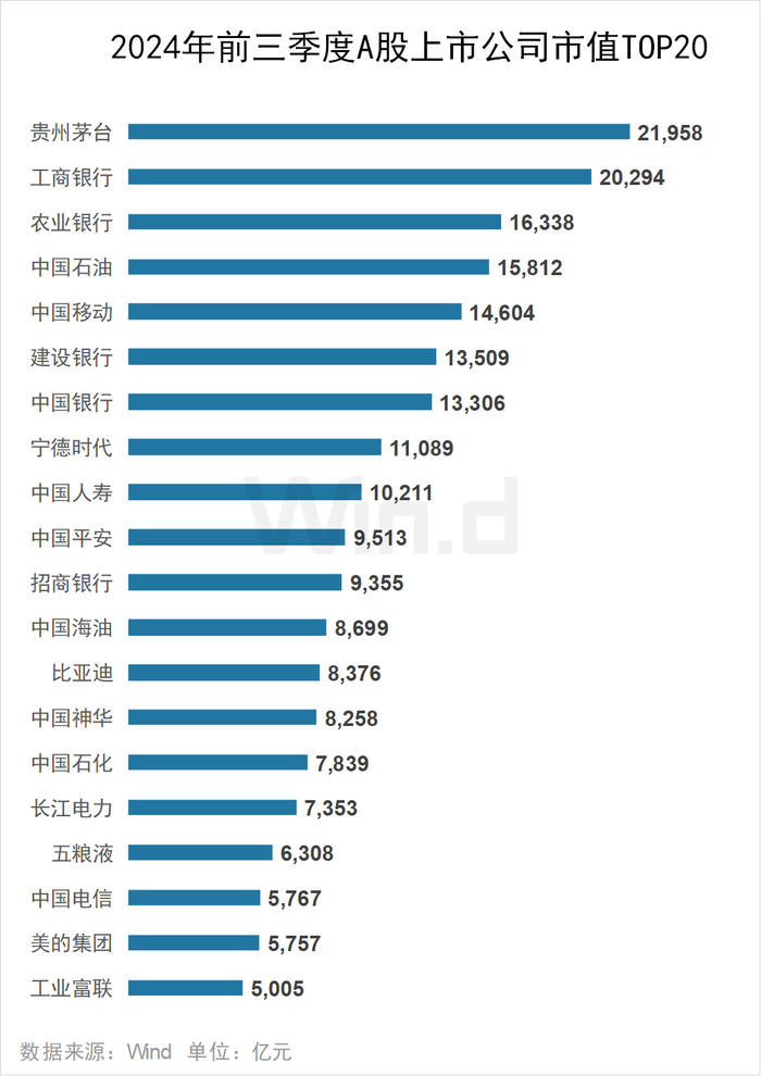 截至2024年三季度末,贵州茅台位居上市公司市值榜榜首,总市值达21958亿元;工商银行总市值亦超2万亿,为20294亿元。农业银行、中国石油、中国移动、建设银行、中国银行、宁德时代、中国人寿总市值均超万亿。