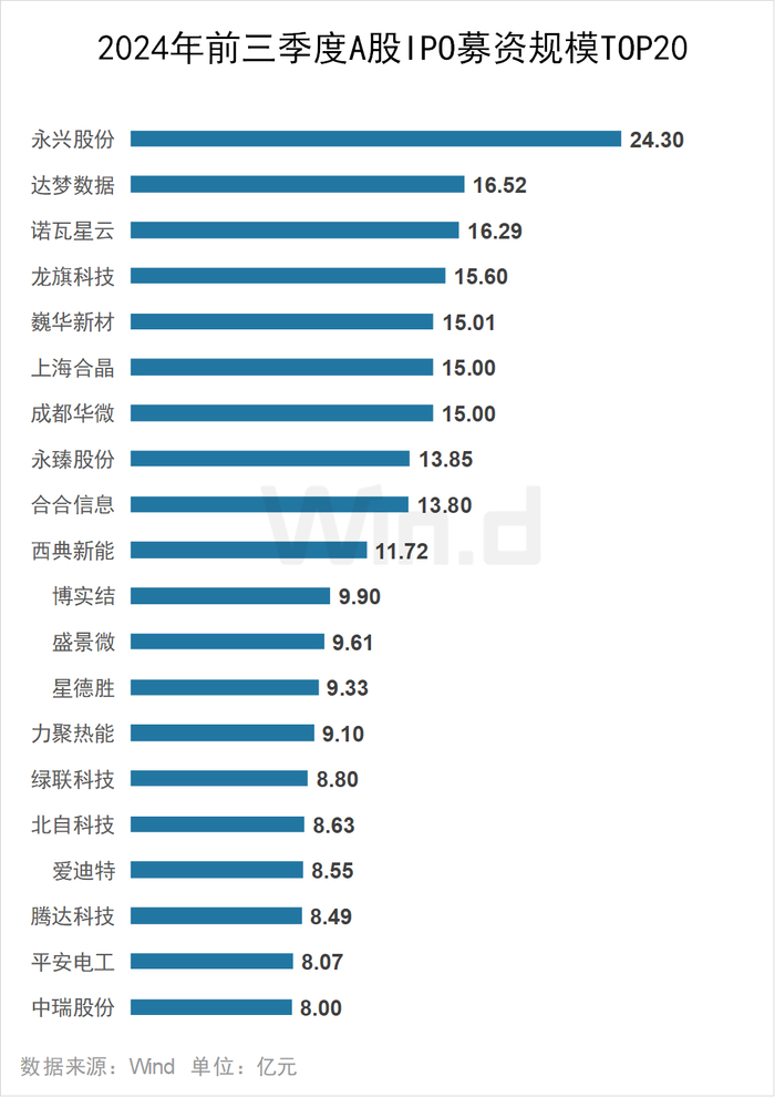 2024年前三季度A股IPO发行的69家公司中,永兴股份IPO募资规模居首,为24.30亿元;此外,达梦数据、诺瓦星云、龙旗科技、巍华新材、上海合晶、成都华微、永臻股份、合合信息、西典新能的IPO募资规模均超10亿元。
