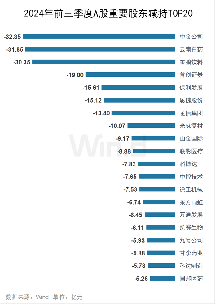 2024年前三季度,中金公司遭重要股东减持32.35亿元,位居减持榜榜首;云南白药、东鹏饮料均遭减持超30亿元,分别为31.85亿元、30.35亿元。首创证券、保利发展、恩捷股份、龙佰集团、光威复材均遭减持超10亿元。