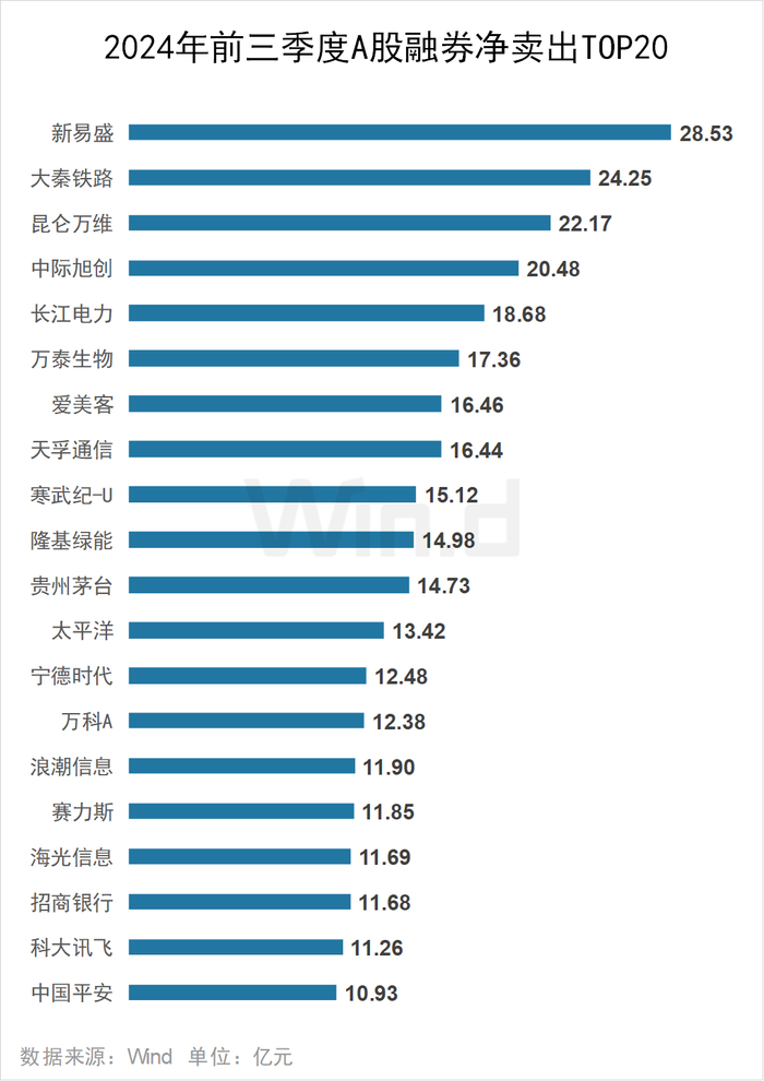 2024年前三季度,招商银行融券净卖出0.39亿元居首;伊利股份、宁波银行分别融券净卖出0.18亿元、0.17亿元。