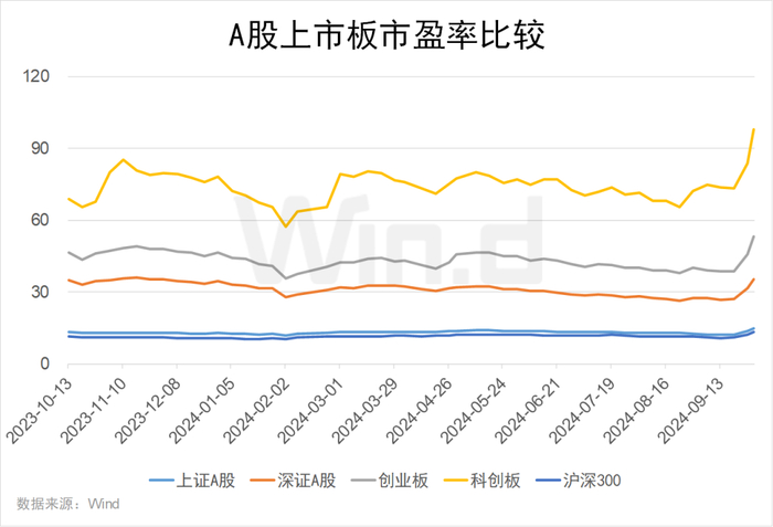 截至2024年三季度末,科创板市盈率最高,为97.79倍;创业板、深证A股市盈率分别为53.07倍、35.18倍;上证A股、沪深300的市盈率较低,分别为14.77倍、13.26倍。