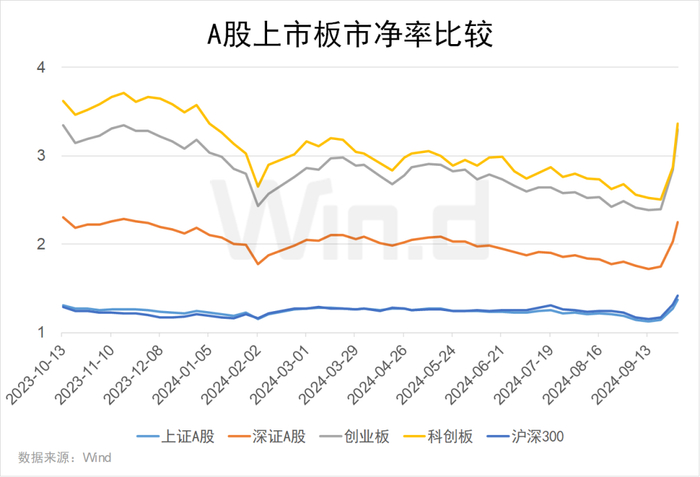 截至2024年三季度末,科创板市净率最高,为3.36倍;创业板、深证A股市净率分别为3.3、2.25倍;沪深300、上证A股的市净率较低,分别为1.41倍、1.37倍。