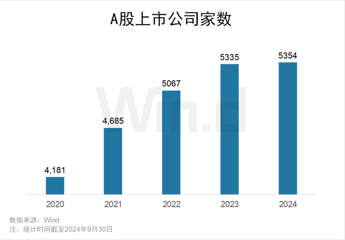 截至2024年三季度末,A股市场共有5354家上市公司,较2023年末增加19家公司。