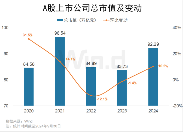2024年三季度末,A股市场总市值约90.29万亿元,较2023年末上升10.2%。