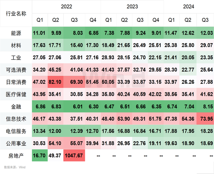 截至2024年三季度末,在Wind一级行业分类的11个行业中(因2022年四季度以来房地产行业持续亏损,不予计算),信息技术行业的市盈率最高,为73.95倍;金融行业的市盈率最低,为8.15倍。