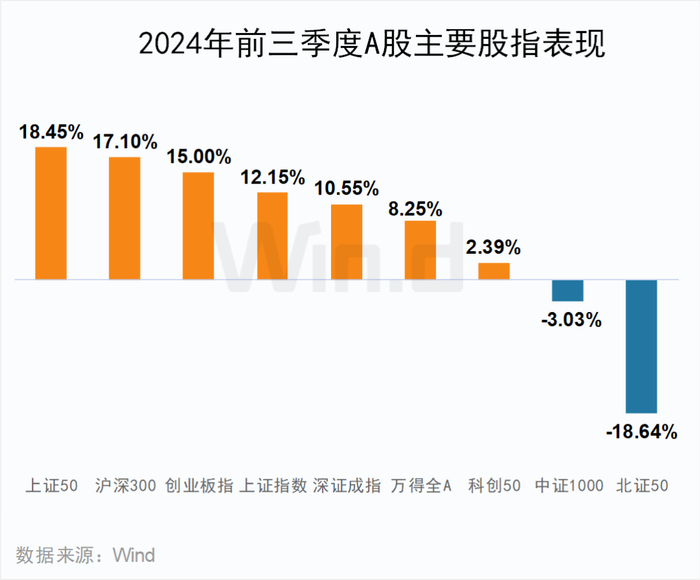 2024年前三季度A股主要股指多数上涨。上证50指数表现最强,累计上涨18.45%,沪深300、创业板指、上证指数、深证成指累计涨幅均超10%。北证50指数下跌18.64%,表现垫底。