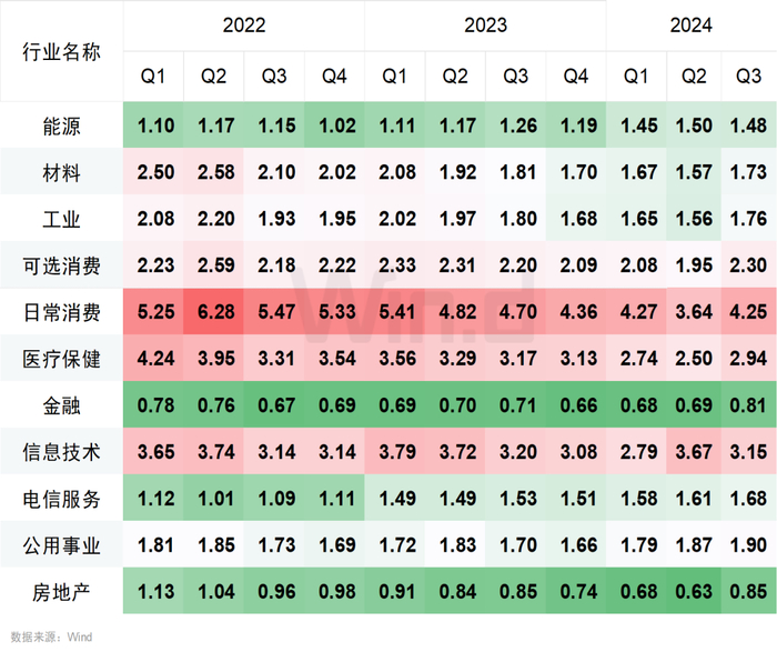 截至2024年三季度末,在Wind一级行业分类的11个行业中,日常消费行业的市净率最高,为4.25倍;金融、房地产行业均破净,市净率分别为0.81倍、0.85倍。