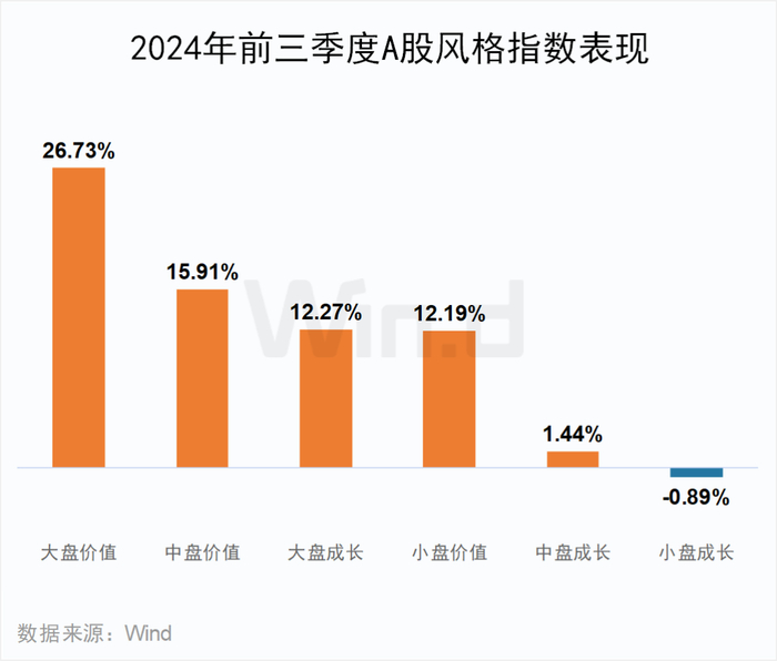 2024年前三季度,大盘价值风格指数表现最为强势,累计涨幅为26.73%;中盘价值、大盘成长、小盘价值累计涨幅均超10%,分别为15.91%、12.27%、12.19%。