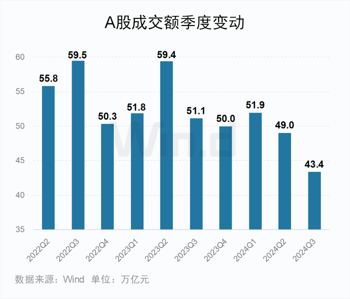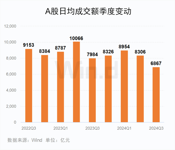 2024年前三季度A股市场总成交额为144.3万亿元,同比下滑11.09%。三季度总成交额为43.4万亿元,环比下降11.43%,日均成交额为6867亿元,环比下降17.32%。