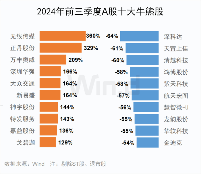 2024年前三季度,无限传媒累计涨幅达360%居首,正丹股份紧随其后,累计涨幅为329%,万丰奥威累计涨幅为209%。深科达前三季度累计下跌64%居跌幅榜榜首,天宜上佳、清越科技累计跌幅分别为61%、60%。