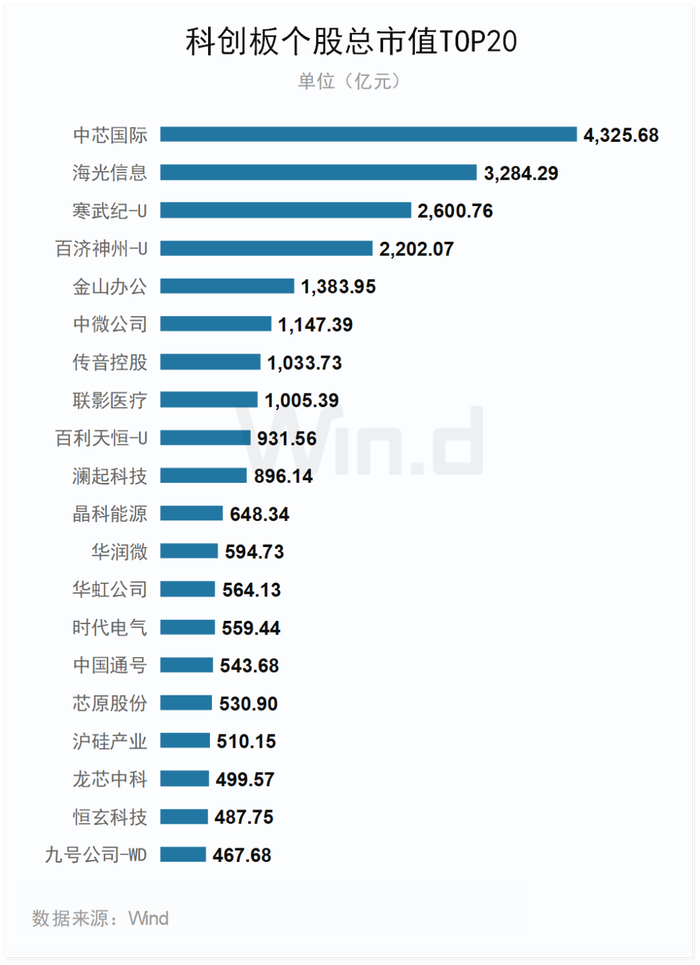 2025年一季度末,中芯国际遥遥领先,市值超过4000亿元。其次海光信息、寒武纪-U、百济神州-U等7家公司市值也突破1000亿元。