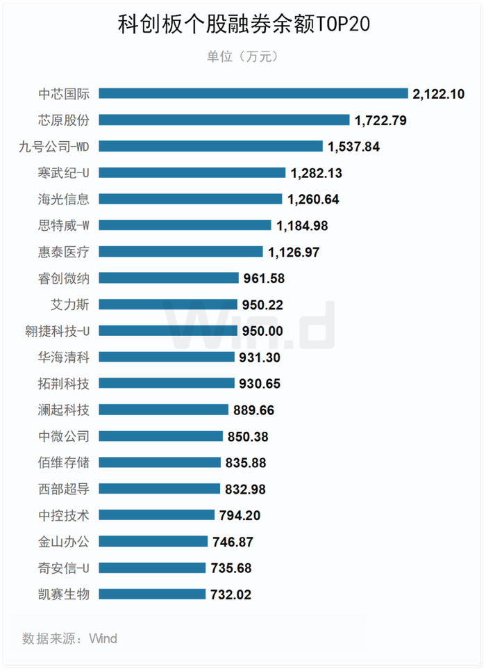 2025年一季度末,中芯国际融券余额以2122.1万元居首,其次芯原股份、九号公司-WD、寒武纪-U等6家融券卖出也超过1000万元。