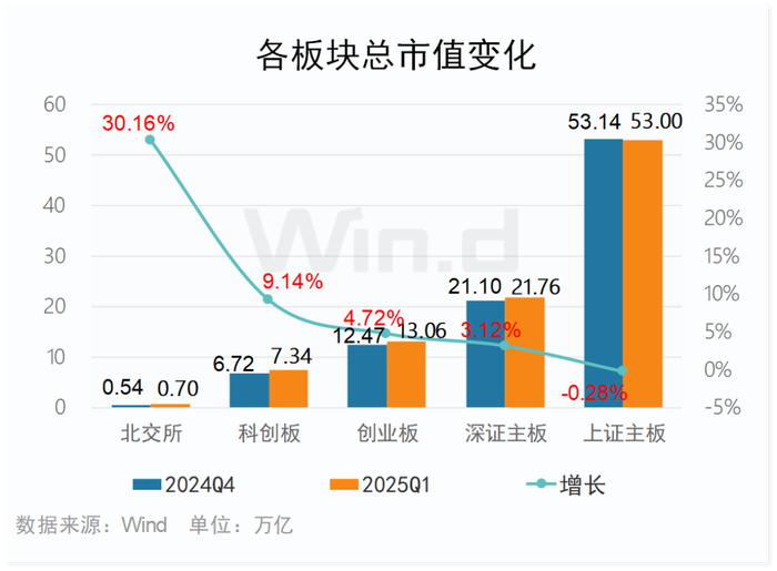 2025年一季度末,科创板总市值为7.34万亿元,环比较2024年四季度末总市值6.72万亿元增加0.61万亿元,增幅9.14%,高于创业板和沪深主板市值增长。