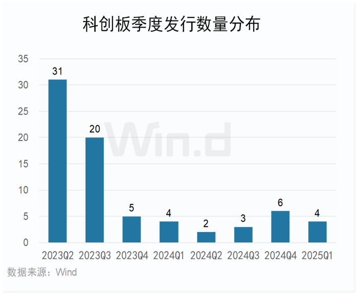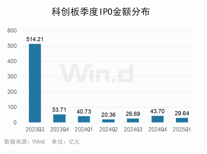 2025年一季度科创板公司IPO合计融资29.64亿,同比下降27.23%。其中1家IPO融资超过10亿元,2家融资在5~10亿元之间,1家融资在5亿元以内。