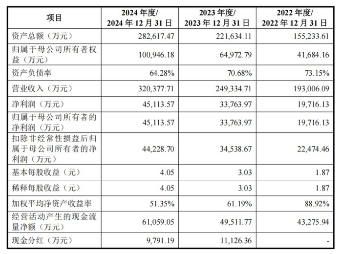 财务数据显示,2022年、2023年和2024年,惠康科技的营业收入分别为19.30亿元、24.93亿元和32.04亿元;归母净利润分别为1.97亿元、3.38亿元和4.51亿元。
