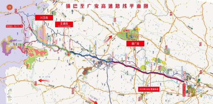 镇广高速是《四川省高速公路网布局规划(2022-2035)》确定的13条纵线之一,线路全长250.825公里,总投资489.089亿元,由川陕界至王坪段、王坪至通江段和通江至广安段组成,其中王坪至通江段已于2022年1月18日通车。项目起于巴中市与陕西交界处,止于广安市前锋区,高效衔接巴万、巴达、营达、南大梁、广安绕城等多条高速,是一条强化省际联系的关键通道。预计到2026年底,镇广高速通江至广安段将完成剩余50多公里建设,到2027年底实现镇广高速全线建成通车。