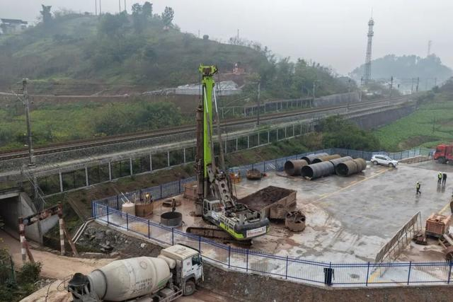 北雁村特大桥位于重庆市涪陵区江北街道,全长778.994米,设计桩基174根、墩台身22个。桥址区地质复杂,多次跨越乡道、省道,且需跨越运营中的渝利铁路。为减少对既有线影响,施工采用转体法工艺,首桩的成功浇筑,为后续转体施工奠定了坚实基础。