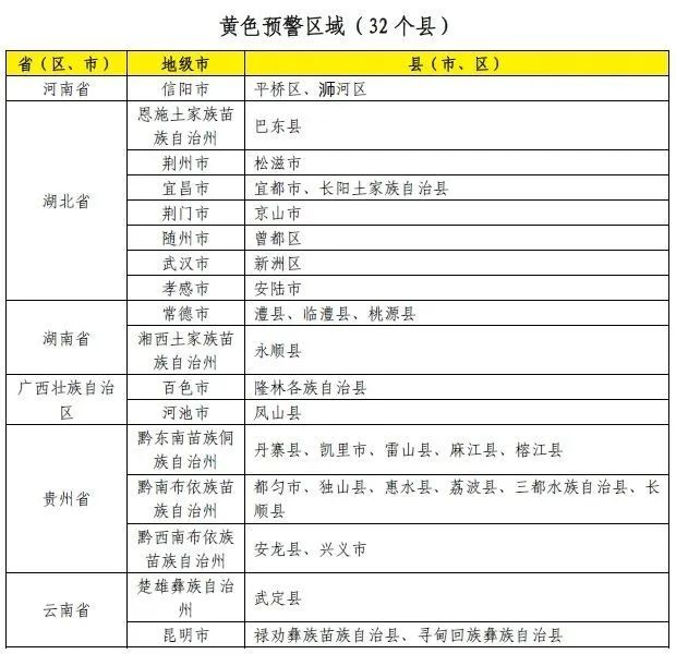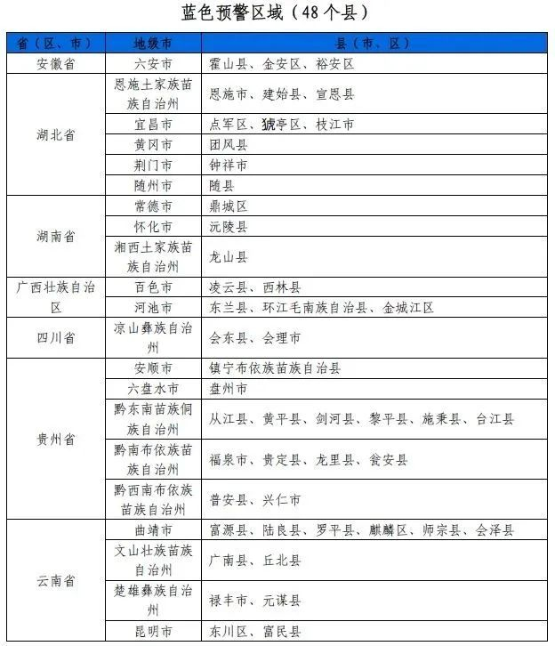预计,6月19日20时至6月20日20时,安徽西部、河南南部、湖北东部和西南部、湖南北部、广西西北部、贵州南部等地部分地区发生山洪灾害可能性大(橙色预警),局地发生山洪灾害可能性很大(红色预警),预警区域涉及的县(市、区)见下表。其他地区也可能因局地短历时强降水引发山洪灾害,请各地注意做好实时监测、防汛预警和转移避险等防范工作。