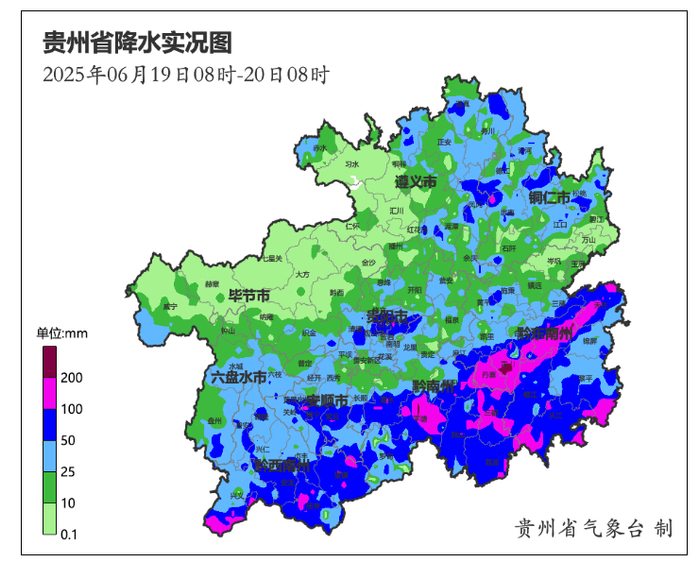 6月19日08时至20日08时,强降雨主要集中在省的南部地区,特大暴雨出现在黔东南州的剑河、天柱、雷山,黔南州的平塘4县域内的9个观测站(乡镇最大为雷山县大塘镇桃江222.5毫米);大暴雨共28县域内的194个观测站,出现在安顺市的关岭、紫云、镇宁,贵阳市的乌当、白云、观山湖,铜仁市的思南、松桃,黔东南州的丹寨、从江、剑河、台江、天柱、榕江、雷山、黎平,黔南州的三都、平塘、惠水、独山、罗甸、荔波、都匀,黔西南州的兴义、兴仁、册亨、安龙、望谟;暴雨出现在64县域内的645个观测站。69个县968站次出现短时强降水,小时雨强最大为关岭县断桥镇92.4 毫米(19日18时至19时)。