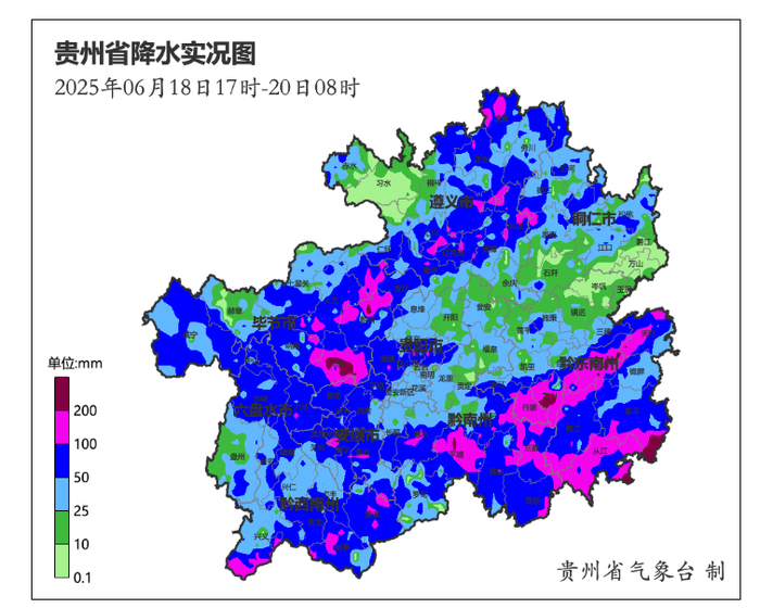6月18日17时至20日08时累计雨量:毕节市的织金、黔西,黔东南州的从江、剑河、天柱、雷山、黎平,黔南州的平塘共8县域内的39个观测站累计雨量超过200毫米(最大为毕节市织金县桂果镇绮陌300.9毫米),50县(市、区)域内的372个观测站累计雨量在100~199毫米之间,81县域内的1564个观测站累计雨量在50~99毫米之间。