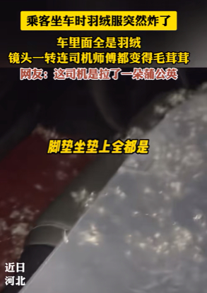 12月29日,河北承德一名网友发布视频称,自己乘坐网约车时,羽绒服突然发生“爆炸”。网友纷纷表示不可思议。