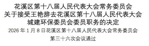 接受王艳辞去花溪区第十八届人民代表大会城建环保委员会委员职务的请求,报花溪区第十八届人民代表大会备案。