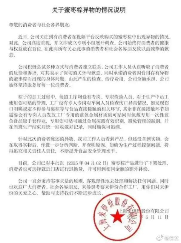 随后,来伊份发表声明称,公司第一时间启动调查程序,确保消费者的权益。
