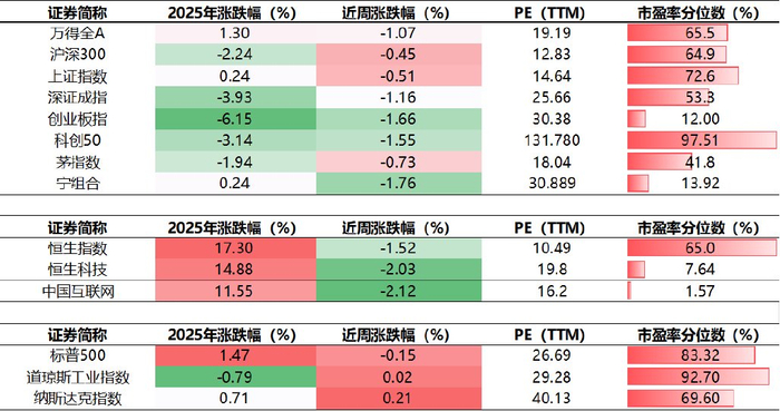 A股:受中东地缘冲突和新消费、创新药回调影响,本周主要宽基指数全部下跌。本周大盘股表现明显好于小盘股,上证指数下跌0.51%,深证成指下跌1.16%,创业板指下跌1.66%。