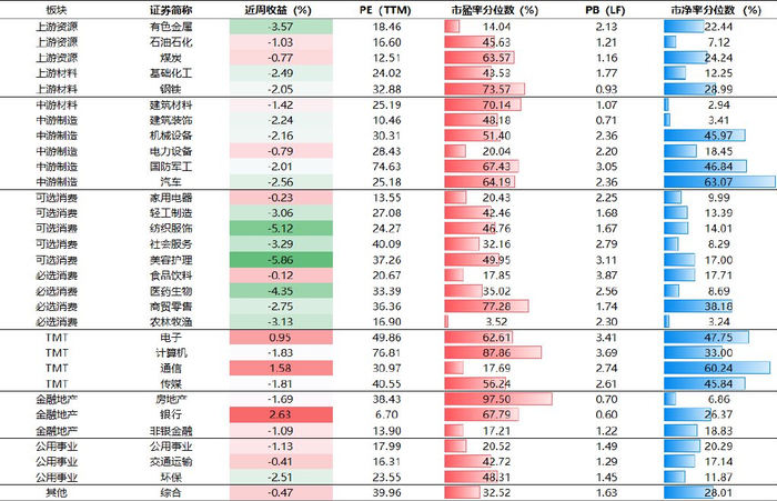 本周银行板块领涨,源于陆家嘴论坛释放金融开放、数字人民币等利好,叠加市场应对外部扰动的避险情绪;石油石化板块受中东冲突升级推升国际油价影响,高位震荡且振幅加大;此外,前期涨幅较大的新消费及创新药板块迎来短期回调。