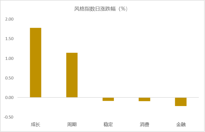 从风格指数上来看,今日各风格表现不一,其中成长风格的个股涨幅最大,金融风格的个股表现最弱。近期风格转换较为明显。