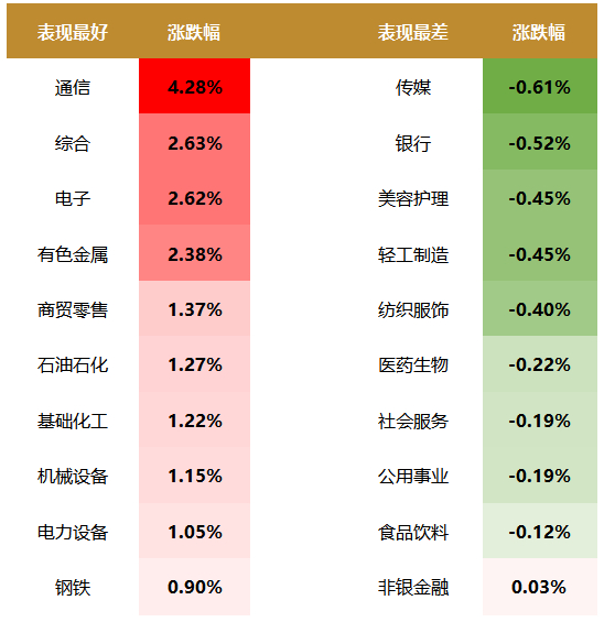 盘面上,31个申万一级行业中有22个行业上涨,其中通信,综合,电子行业领涨,涨幅分别为4.28%,2.63%,2.63%。传媒,银行,美容护理行业下跌,跌幅分别为0.61%,0.52%,0.45%。