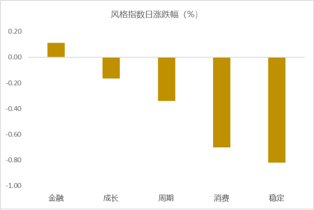 从风格指数上来看,今日多数风格表现不佳,其中金融风格的个股表现最好,稳定风格的个股表现最弱。近期风格转换较为明显。