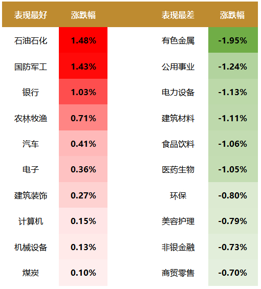 盘面上,31个申万一级行业中有10个行业上涨,其中石油石化,国防军工,银行行业领涨,涨幅分别为1.48%,1.43%,1.03%。有色金属,公用事业,电力设备行业领跌,跌幅分别为1.95%,1.24%,1.13%。