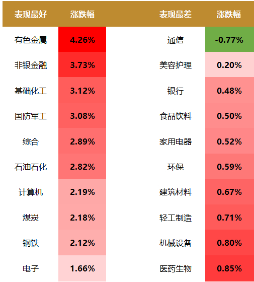 盘面上,31个申万一级行业中有30个行业上涨,其中有色金属,非银金融,基础化工行业领涨,涨幅分别为4.26%,3.73%,3.12%。通信行业下跌,跌幅为0.77%。