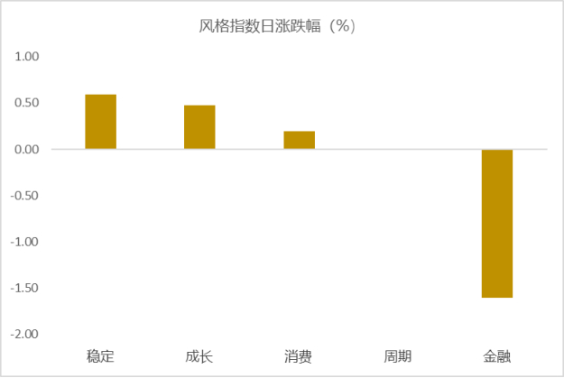 从风格指数上来看,今日各风格表现不一,其中稳定风格的个股表现最好,金融风格的个股表现最弱。近期风格转换较为明显。