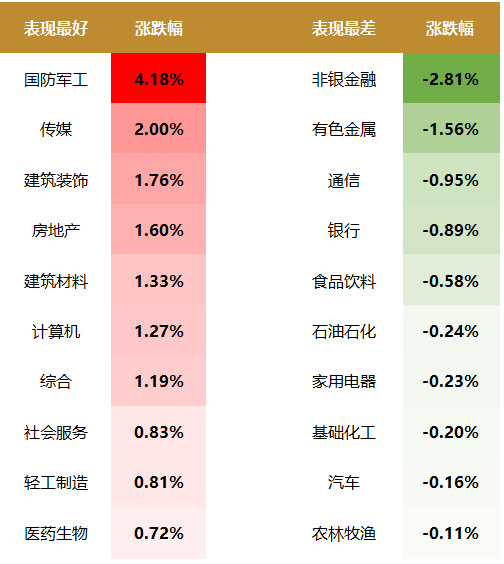 盘面上,31个申万一级行业中有20个行业上涨,其中国防军工,传媒,建筑装饰行业领涨,涨幅分别为4.18%,2.00%,1.76%。非银金融,有色金属,通信行业领跌,跌幅分别为2.81%,1.56%,0.95%。