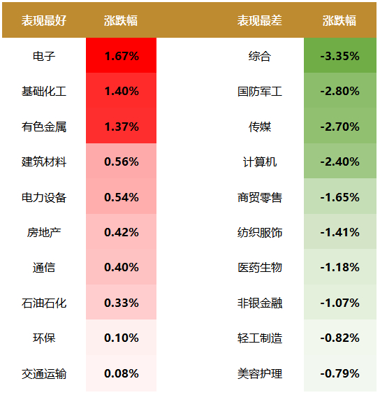 盘面上,31个申万一级行业中有11个行业上涨,其中电子,基础化工,有色金属行业领涨,涨幅分别为1.67%,1.40%,1.37%。综合,国防军工,传媒行业领跌,跌幅分别为3.35%,2.80%,2.70%。