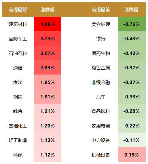盘面上,31个申万一级行业中有22个行业上涨,其中建筑材料,国防军工,石油石化行业领涨,涨幅分别为4.09%,3.23%,3.07%。美容护理,银行,医药生物行业领跌,跌幅分别为0.76%,0.43%,0.42%。