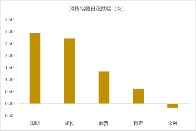 从风格指数上来看,今日各风格表现不一,其中周期风格的个股表现最好,金融风格的个股表现最弱。近期风格转换较为明显。