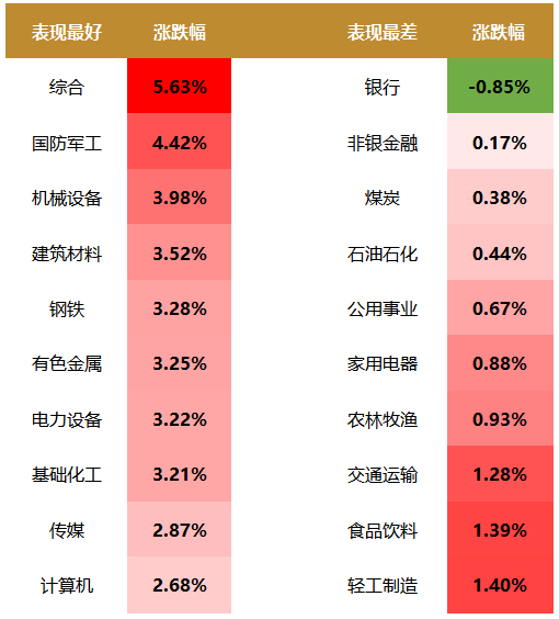 盘面上,31个申万一级行业中有30个行业上涨,其中综合,国防军工,机械设备行业领涨,涨幅分别为5.63%,4.42%,3.98%。银行行业领跌,跌幅为0.85%。